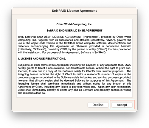 5. Read the SoftRAID License Agreement and click on “Accept” (note that this window might not pop up if you are updating or upgrading SoftRAID).