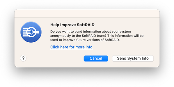 6. You can send information about your system anonymously to the SoftRAID team to help us to improve future versions of SoftRAID. If you opt not to send your system information, click on “Cancel” (note that this window might not pop up if you are updating or upgrading SoftRAID).