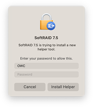 4. Enter your administrator credentials to allow SoftRAID to install its helper tools.