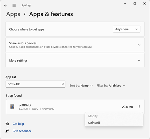 4) With SoftRAID listed, click the three dots for the Uninstall option and confirm uninstall.