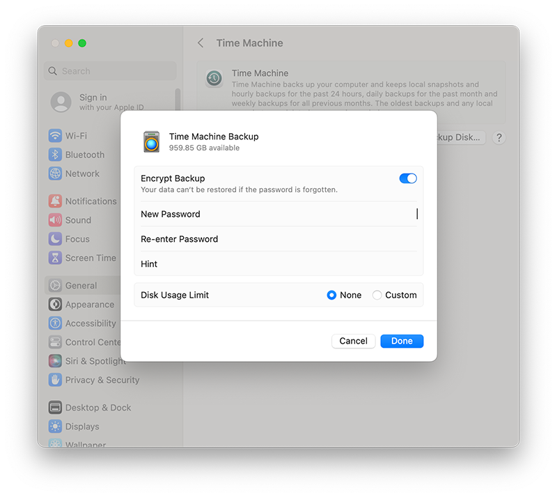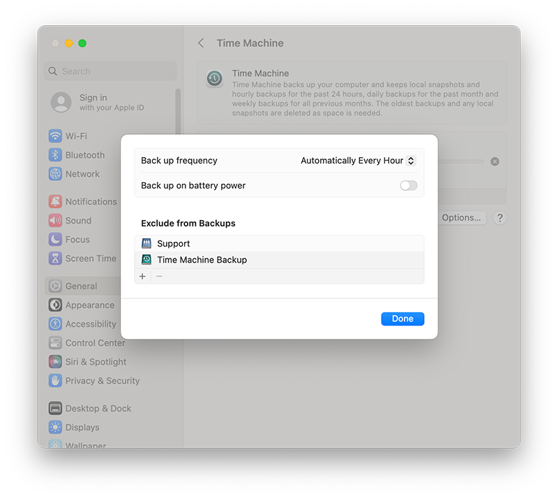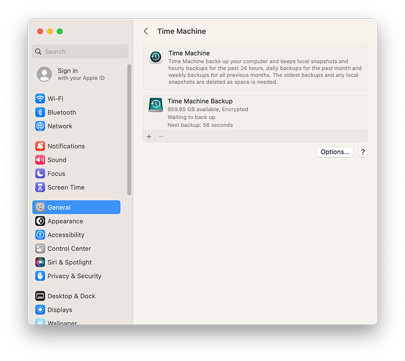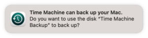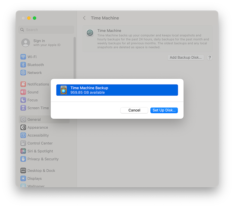 If at any time you want to add (or remove) a connected SoftRAID volume as a Time Machine target, you can do so by going to Time Machine in System Settings, and using “Select Backup Disk” to select your volume. (Note: even though Time Machine says “Select Backup Disk” it’s really the volume on the disk that’s being used for the backup).