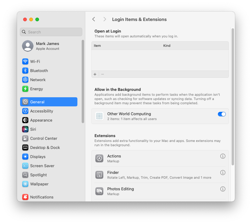 - Reopen System Settings → General → Login Items & Extensions → Allow in the Background
