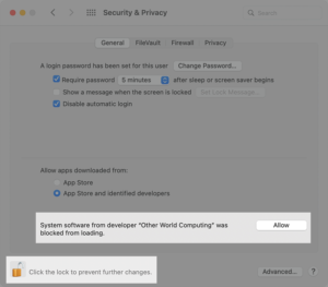 Look for a line saying “System software from developer ‘Other World Computing’ was blocked from loading” and click “Allow” to enable the extension to be installed.