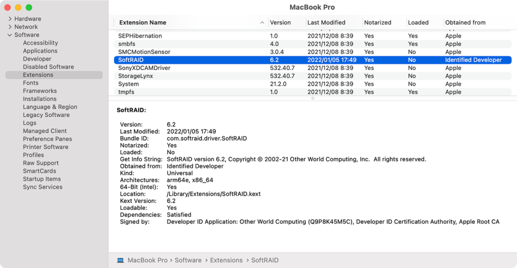 As an alternative, choose Apple menu > About This Mac > System Report. Go to Software > Extensions and wait for the extensions to load, then look for the SoftRAID extension and check if says Yes or No for Loaded.
