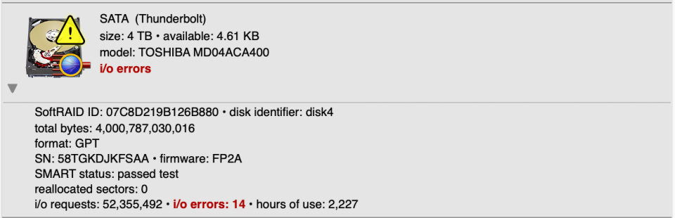 SoftRAID maintains a persistent error count for each disk. This count is stored directly on the disk itself, which means SoftRAID can alert you to a disk problem days or weeks after the error occurred — even if your Mac has been restarted many times since then. Each time you start up, SoftRAID checks these counters and will display a dialog and send an email notification if any disk has a non-zero error count.