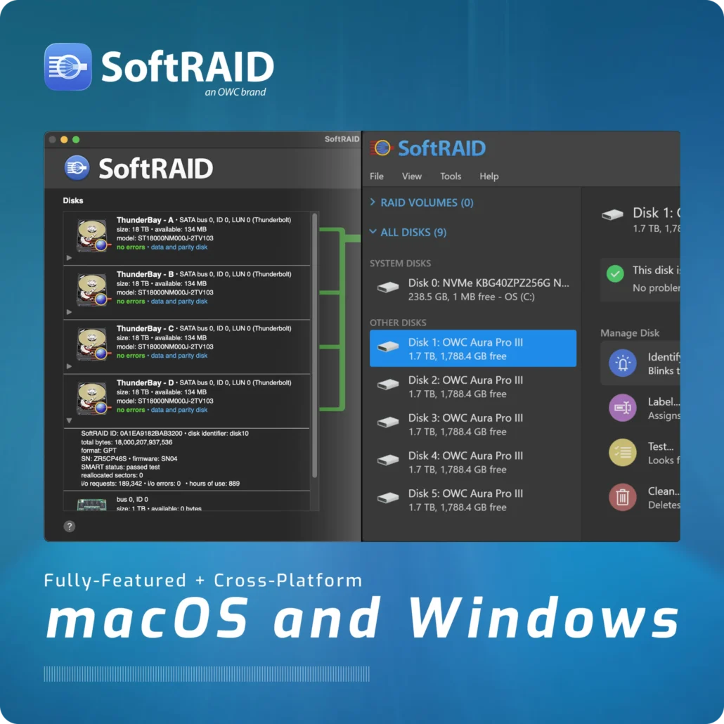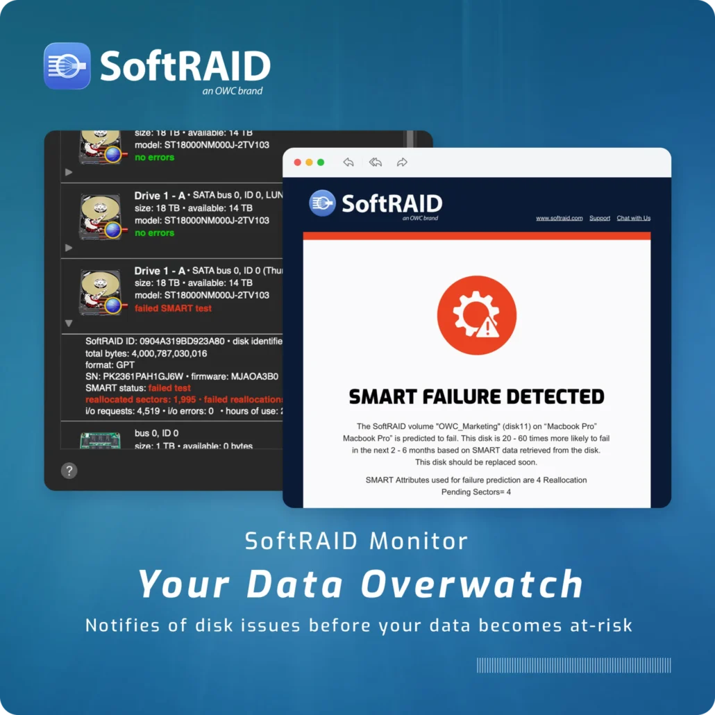 Quickly accessing your data with the right safeguards is a difficult balance. Whether you’re enhancing multimedia production workflows, protecting critical business files, or ensuring uninterrupted access to valuable data, OWC’s SoftRAID is the ideal solution to manage your RAID arrays — delivering robust protection coupled with exceptional speed.
